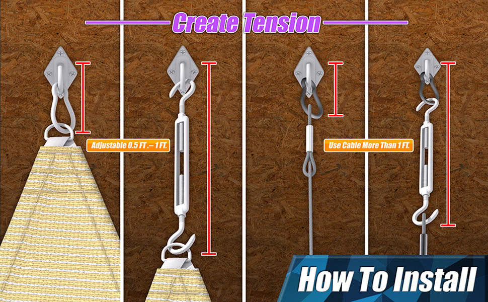 INSTALLATION GUIDE: Separate installation hardware kits are necessary and sold separately. Each D-ring requires one cable rope (avoid using nylon ropes, as they break easily). Connect the other ends of cables to existing poles, trees, or walls using our shade sail hardware kits. We strongly recommend using high-quality ShadeMart® hardware kits and cables for optimal performance and appearance.